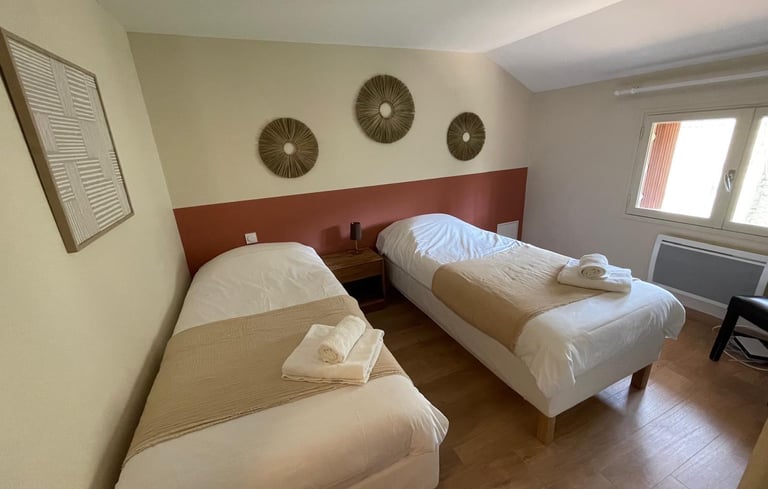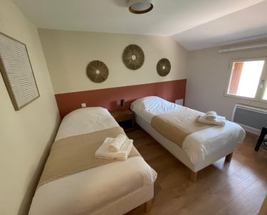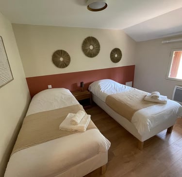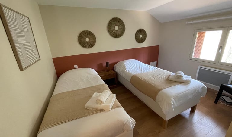 Bienvenue dans notre chambre twin confortable et fonctionnelle, idéale pour les voyages en duo ou pour ceux qui préfèrent avoir leur propre espace. Équipée de deux lits simples douillets, cette chambre offre un cadre reposant pour une bonne nuit de sommeil après une journée bien remplie.