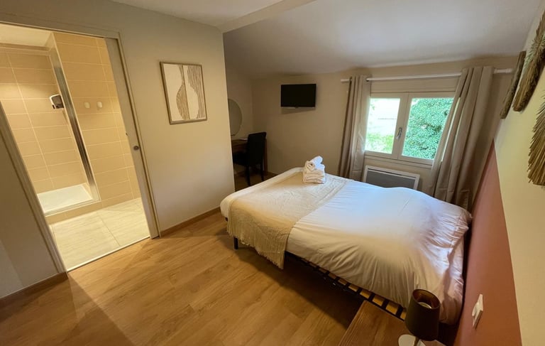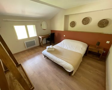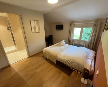 Découvrez notre chambre double, un havre de confort et de tranquillité pour votre séjour. Équipée d'un lit double douillet, d'une salle de bain privative avec douche et toilettes, cette chambre offre un espace intime où vous pourrez vous détendre en toute sérénité. Profitez d'une nuit paisible dans notre chambre, savourez une douche revigorante et appréciez les petits détails qui rendront votre séjour mémorable. Une escapade parfaite pour les couples ou les voyageurs en solo en quête de confort et de commodité.