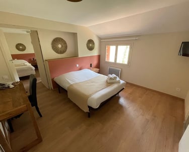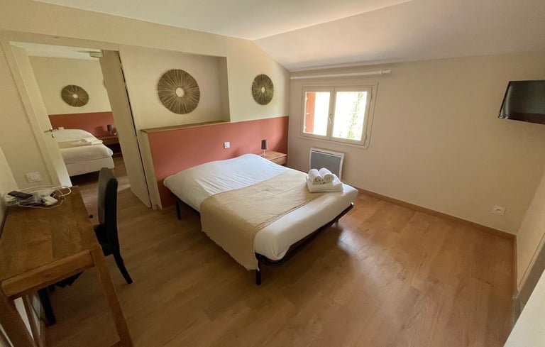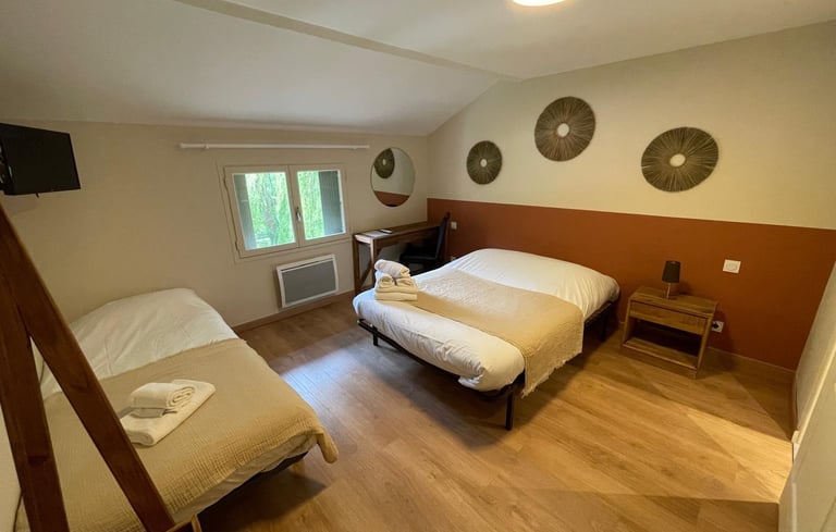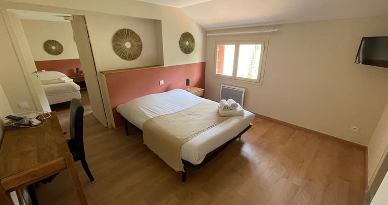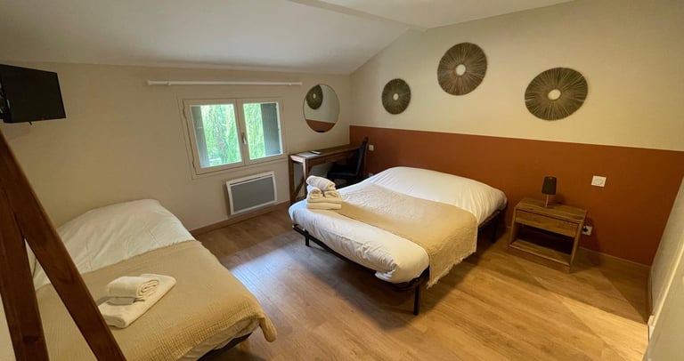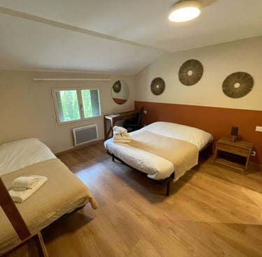 Bienvenue dans notre chambre familiale spacieuse et accueillante, parfaite pour un séjour en toute sérénité à quatre. Conçue pour le confort de toute la famille, elle dispose d’un grand lit double et de deux lits simples, garantissant à chacun un espace de repos optimal après une journée bien remplie.