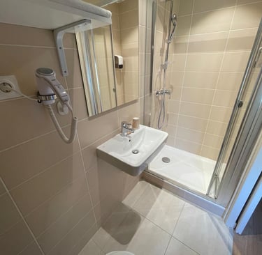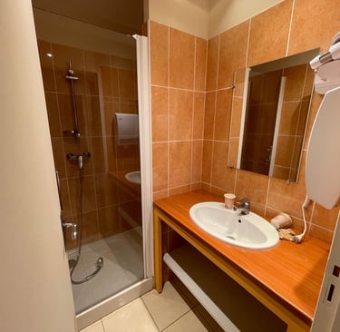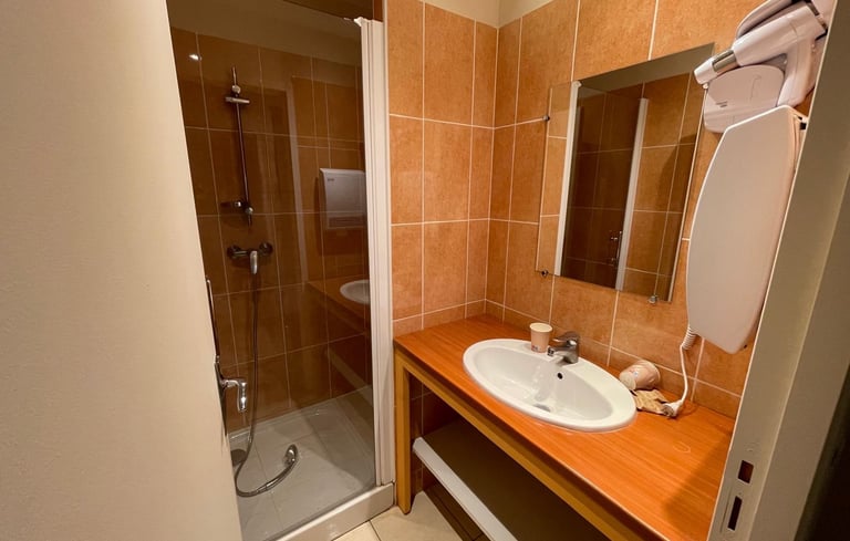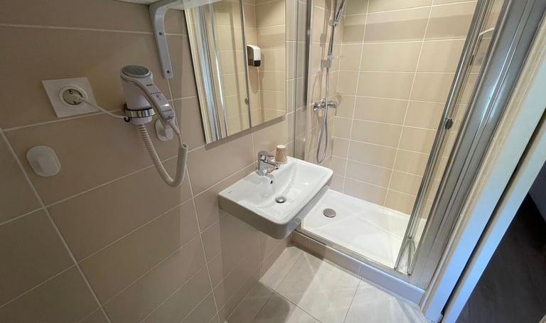La salle de bains attenante est équipée d'une cabine de douche, d'un lavabo et de toilettes, offrant commodité et intimité pour votre séjour. Des serviettes et des articles de toilette essentiels sont mis à votre disposition pour votre confort.